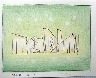 2019年2月24日(日) エスキース(森のコンサートホール) 色鉛筆で色を付けた際に、ざっくり描いたこげ茶の縦のストロークが、木々の重なりのように見えた・・・ それで付けたタイトルです。 久しぶりに気に入ったものが描けたのでこれを作品にしようと思い、キャンバスに描き始めました。 |