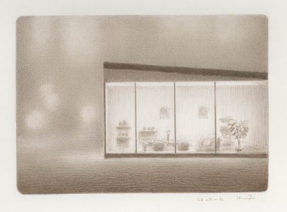 2019年7月21日(日) ドローイング 「ショールーム」 ![]() ハガキのサイズに単色の色鉛筆で描いたもの。 この手の「夜の街角」的な絵は作品として仕上げたものも多いけれども、エスキースはまだまだたくさんあって、いい加減作品にするのも飽きたというと語弊がありますが、もう少し違う絵を描きたいという欲望の方が強くなってきました。 でもこのままエスキースを埋もれさせてもなんなので、こうして小さなドローイングにしてみたらいいかも、制作時間も短いし、単色で出せる雰囲気も良いし、一石二鳥だ、なんてなことを考えついて何点か描きました。 追々ここに載せていこうと思います。 今、北海道の方でのグループ展に参加していて、そこで発表しています。 |