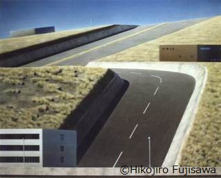 2022年1月23日(日) 振り返り中 第13 回制作年:1987 130号 実家に程近い所に開通した幹線道路のバイパスは、こんな金属製の防音壁が延々続いていました。 私の大好きだったレコードジャケット(ウェス・モンゴメリーのロードソング)を思い浮かべ、絵にしたいと思いました。 この頃になるとインパクトを求めて画面を直線だけで構成するようになり、現実の風景から離れて行きます。 初個展を銀座の貸画廊で開いた時のDMに使った絵です。 自分の中の原風景の一つである郊外をテーマに、自然破壊への抗議でもなく、文明賛歌でもない、情を挟まない透徹したニュートラルな世界を描きたかったのです。 |