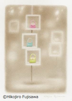 2022年9月25日(日) 個展に出します ![]() タイトル: ショーケース 大きさ: ハガキ大 画材: 紙に色鉛筆と鉛筆 バッグを売るお店のショーケース。 |
