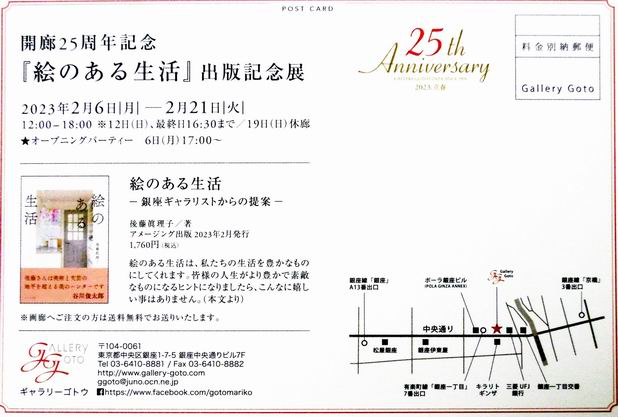 2023年1月22日(日) 展覧会のお知らせ いつもお世話になっているギャラリーゴトウさんが、今年2月に開廊25周年を迎え、オーナーの後藤さんが本を出版されました。 開廊25周年、出版記念展を開催します。 総勢46名の展覧会です。 2月6日(月)~21日(火) 私も小品を1点出品いたします。 只今制作中です。 完成したらここに掲載します。 |