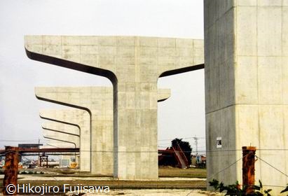 2023年10月8日(日) 趣味で撮っていた写真 その25 撮影年: 1990年 撮影場所: 草加新田 解説: 松原団地のすぐ隣に建設中の東京外環自動車道です。 まだ橋脚だけなので、T、T、T です。 写真では伝わらないかもしれませんが、実物を目のあたりにすると、巨大な存在感がかなりシュールで圧倒されます。 なお且つ現代アートしています。 |