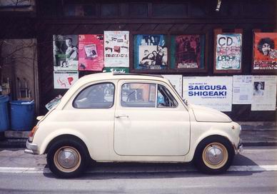 2024年6月28日(金) 先週のクルマつながりで、こちらはスモールカーです。ルパン三世でおなじみのフィアット500。 撮影年代は1990年代。 場所は西武池袋線江古田駅近く。 中古レコード屋さんの店の横に停まっているのをよく見かけました。 壁のポスターとよくマッチしています。 画面左の青いゴミバケツも、ポスターと共に市街地の雑多な雰囲気を醸し出していて良いです。 |