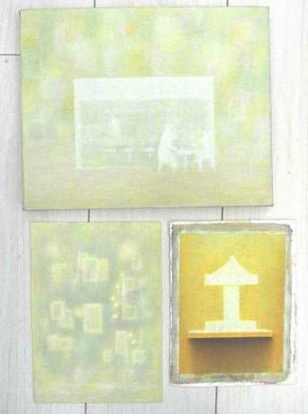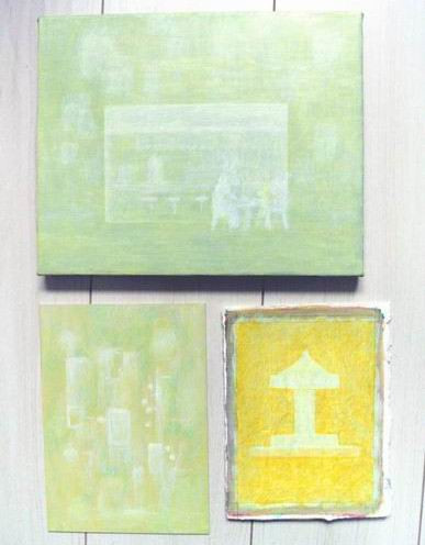 2024年7月16日(火) 最近ようやく制作を再開しました。 これから描く絵のエスキースを20点ぐらい作っていました。 その中から3点を選んで同時進行でスタートです。 上はオープンカフェのようなところ。動物がいます。 色はまだ決まっていませんが、大体のイメージは出来ています。 左下はまだ何か、自分でもわかりません。 ショーウィンドーのディスプレイをイメージしていますが、都市空間のような感じにも見えてきました。 画面との気長な対話とうか、丁寧なやり取りを続ける以外にありません。 右下は初め建物のようなものを描こうとしていましたが、下描きしているうちに棚の上の回転木馬の置物に見えてきてしまって、そのままそっちの絵にすることにしました |