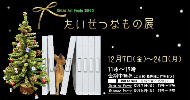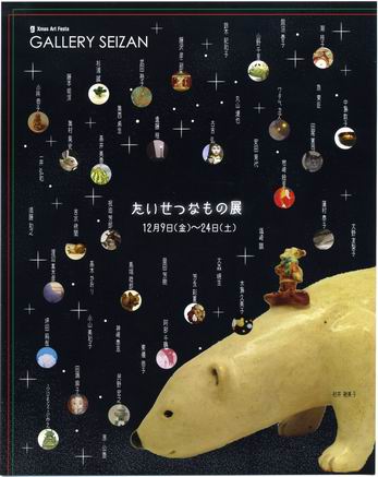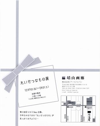 ★2011 ![]() 銀座で恒例のXmasアートフェスタに合わせた、靖山画廊「たいせつなもの展」に出品します。 会期 : 12月9日(金)〜24日(土) 会期中無休 会場 : 靖山画廊 東京都中央区銀座5−14−16 銀座アビタシオン1階 時間 : 11:00〜19:00(土日祝は17:00まで) |