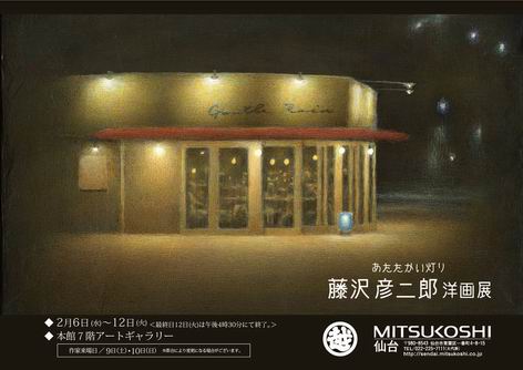 ★2013 個展 仙台三越にて、藤沢彦二郎 洋画展−あたたかい灯り− を開催いたします。 仙台方面にお住まいの方は、是非ご高覧ください。 会場:仙台三越百貨店 本館7階アートギャラリー 期間:2月6日(水)〜12日(火) 期間中無休 時間:午前10時〜午後7時 (最終日12日は午後4時半まで) |