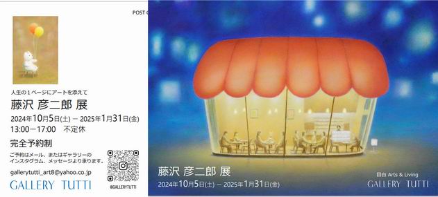 ★2025年 個展のご案内 (終了いたしました。) ![]() 藤沢 彦二郎 シュールな風景展 若い頃に「郊外」をテーマに、ちょっとシュールな風景を描いていた時代の大作の、その未公開の下描きを今回初出展します。 お見せしていない藤沢彦二郎を、この機に是非ご高覧ください。 会期: 11月23日(日)〜12月13日(土) 時間: 11:00〜17:00 場所: GALLERY TUTTI (ギャラリートゥッティ) 東京目白(JR目白駅より徒歩5分) 予約制となっております ご予約はインスタグラムのメッセージより承ります。 ( gallery tutti で検索すると先頭に出てきます。) 「日常の生活空間の中でアートと触れ合う」をコンセプトにした、 目白のマンションの一室を使ったギャラリーです。 秘密の隠れ家的な雰囲気を楽しんでいただければと思います。 |