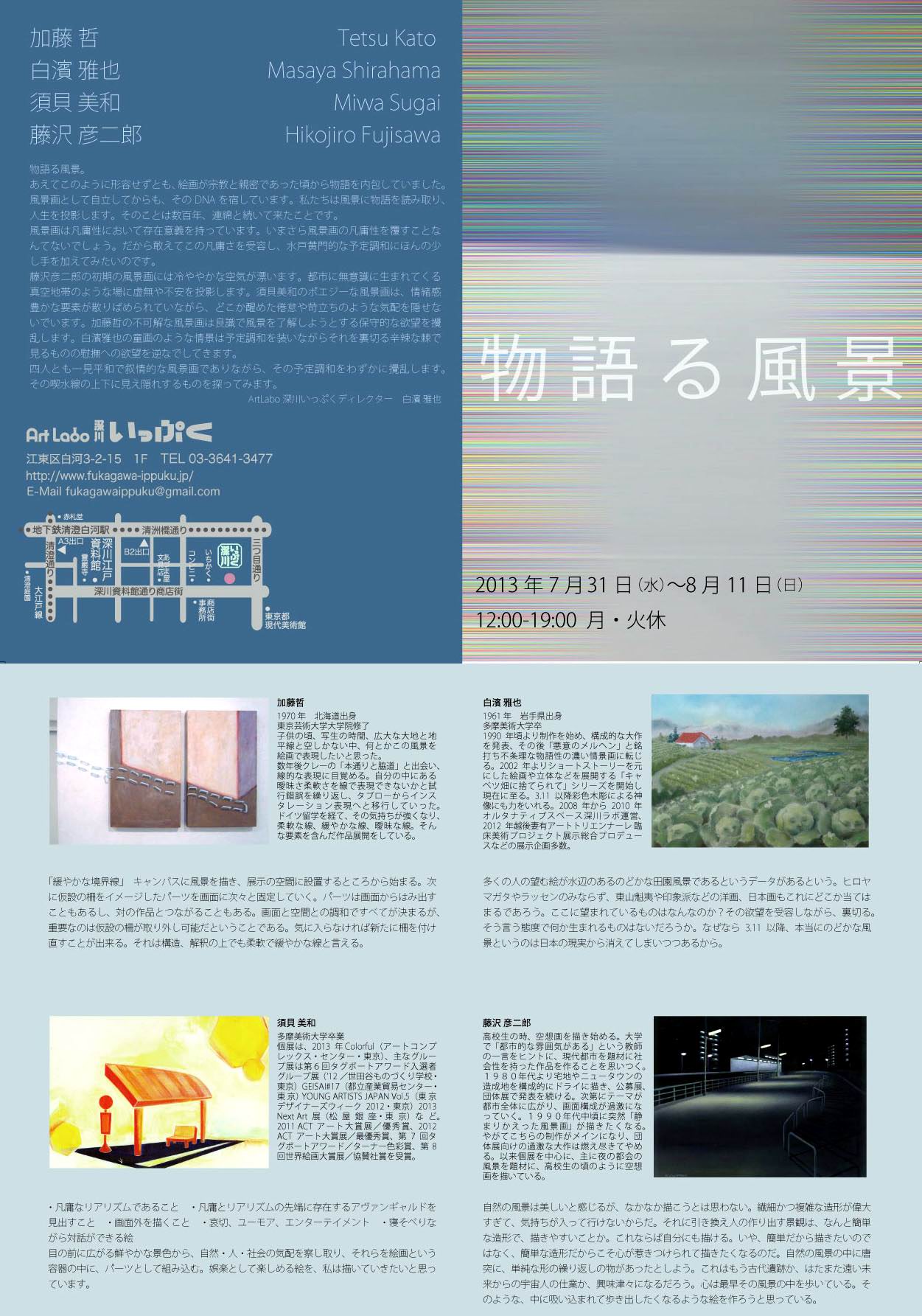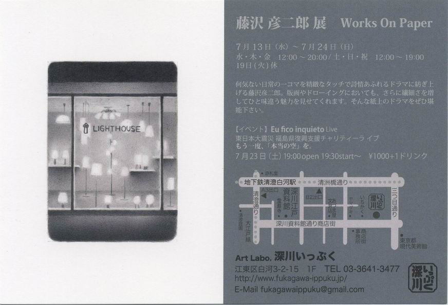★2011 個展 ![]() ●藤沢 彦二郎 展 Works On Paper カフェギャラリーで、版画、鉛筆画などの紙の仕事を展示します。 会場 :: Art Labo. 深川いっぷく 東京都江東区白河3−2−15 1F アクセス: 東京都現代美術館近く。 地下鉄都営大江戸線「清澄白河」A3出口より徒歩9分 東京メトロ「清澄白河」B2出口より徒歩5分 会期 : 2011年7月13日(水)〜24日(日) 19日(火)はお休み 時間 : 水・木・金12:00〜20:00 土・日・祝12:00〜19:00 イベント: 23日(土) Eu fico inquieto Live 東日本大震災福島県復興支援チャリティーライブ もう一度、「本当の空」を。 19:00 open 19:30 start \1,000+1ドリンク |
