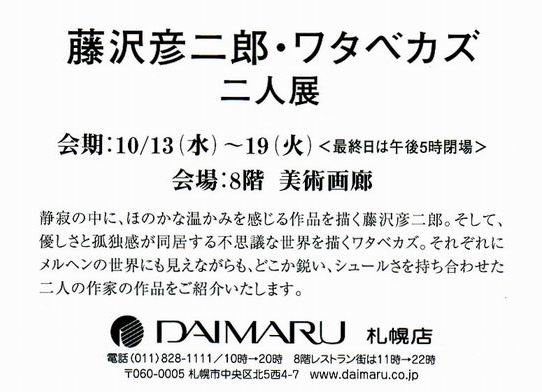 ●札幌大丸8階美術画廊にて、ワタベカズさんとの2人展を開催いたします。 期間 : 2010年10月13日(水)〜19日(火) 時間 : 午前10時〜午後8時 |